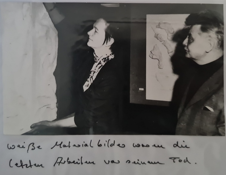 Direkt nach dem Krieg 1945 begann er ernsthaft zu zeichnen und zu malen. Es gab keine Farben zu kaufen, er nahm Kohlereste, mischte Asche und was er sonst fand. Er verarbeitete so die schrecklichen Bilder des Krieges, „Der alte Mann“, „die Jüdin“, viele Frauenköpfe und Mutter und Kind Szenen. Es gibt Frauenköpfe und Mutter und Kind Szenen. Es gibt Frauenköpfe aus der Zeit, die Imina ähneln, die er ja erst später kennen lernte, dann aber sofort „erkannte“, als er sie 1948 in Köln sah.